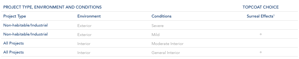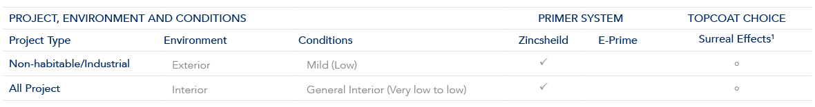 Use the following table to help identify where Surreal Effects can be applied on steel projects. Refer to the conditions information to determine the environment that your project will be exposed to.