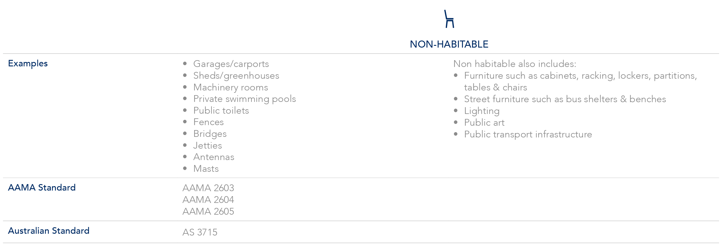 Non-habitable projects are buildings, structures or items that are not dwelling types. Examples can be bus shelters, furniture, lighting, garages, fences and bridges.