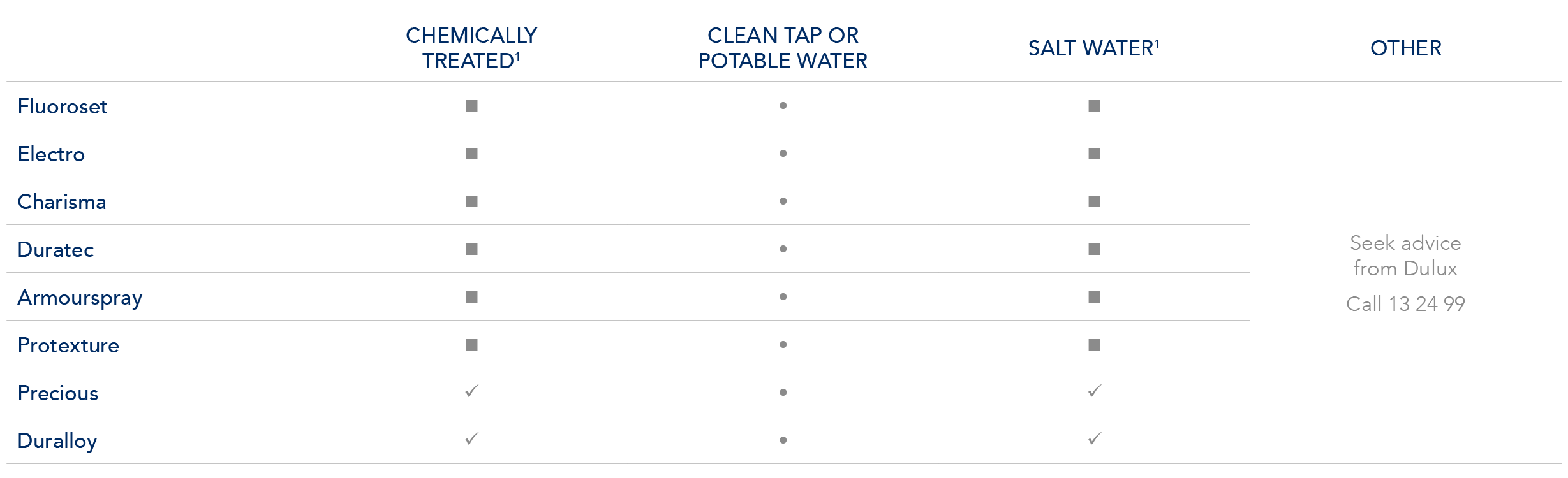 1. Aggressive liquids such as Chemically Treated liquids and Salt Water must be cleaned off immediately as per the Dulux Care and Maintenance guide.