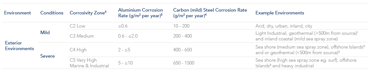 Use the following table which references AS2312.1, AS 4312 and ISO 9223 to identify the environment, conditions and atmospheric corrosivity categories