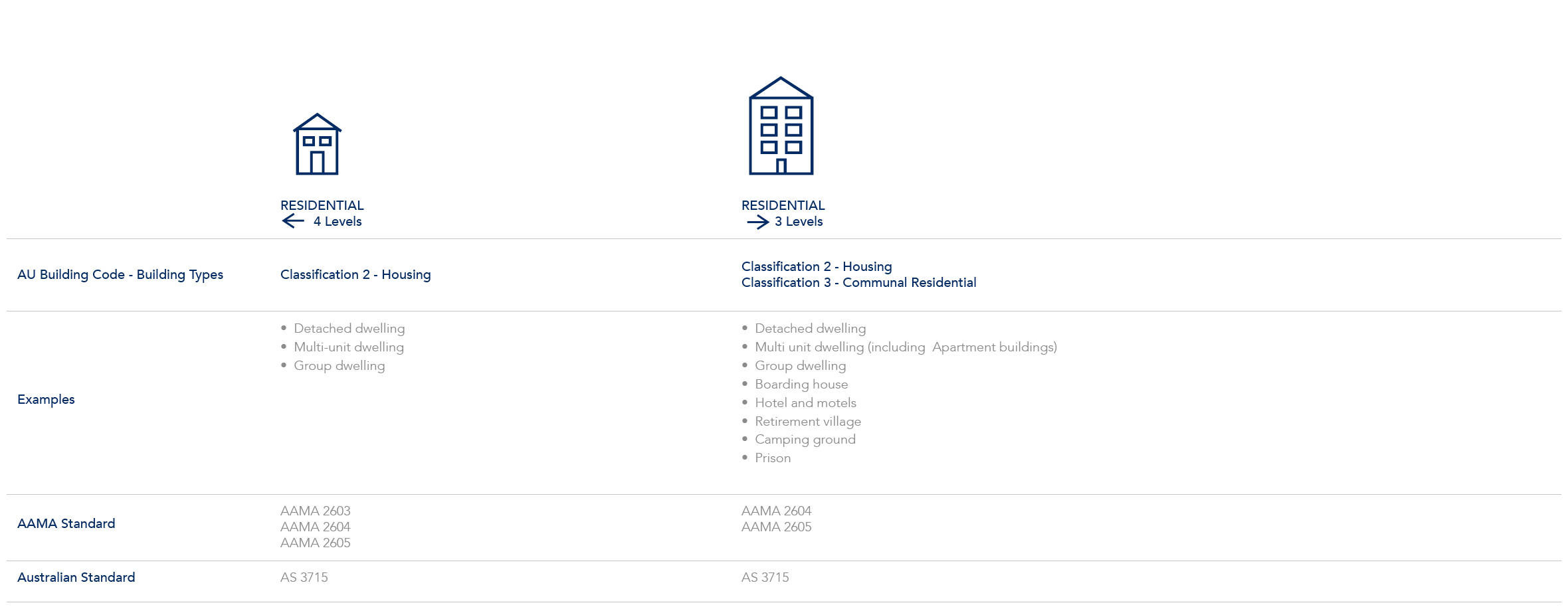 The following tables detail the BCA classes, building examples in those classes, and the industry standards that a product should meet to be suitable.