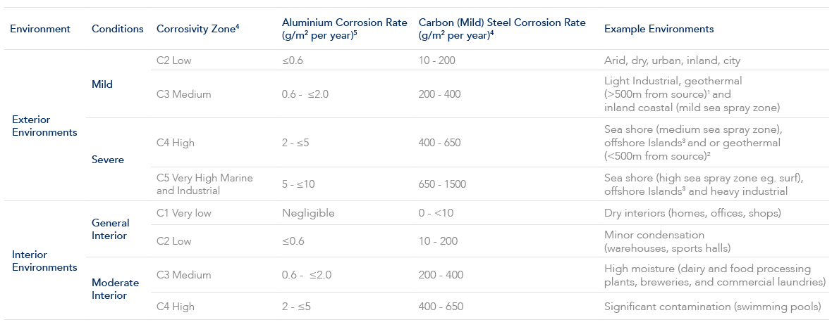 Use the following table which references AS2312.1, AS 4312 and ISO 9223 to identify the environment, conditions and atmospheric corrosivity categories.