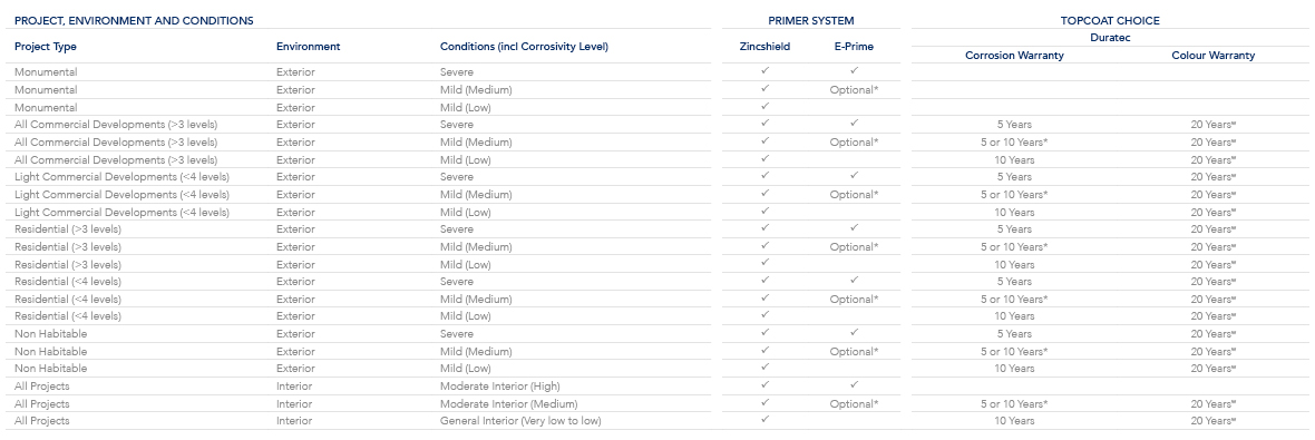 Use the following table to help identify where Duratec can be applied on aluminium projects, the system required and the Dulux Alumi Shield™ warranty level available. Refer to the conditions information to determine the environment that your project will be exposed to.