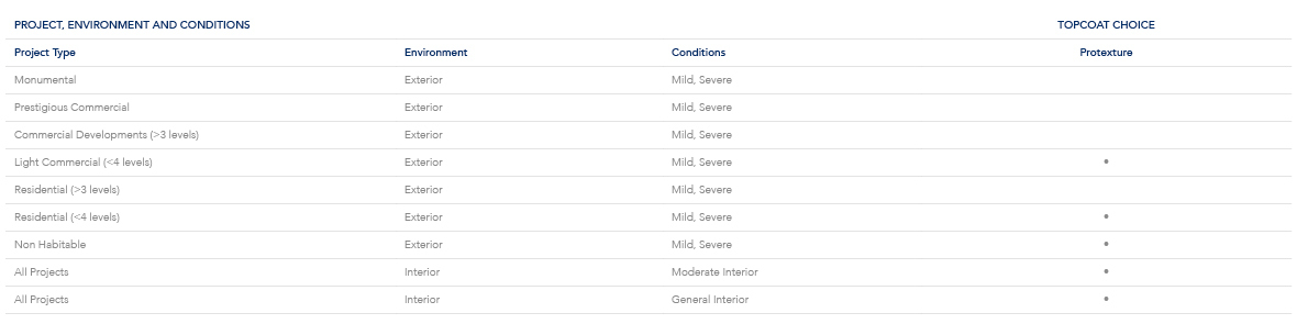 Use the following table to help identify where Protexture can be applied on aluminium projects, the system required and the Dulux Alumi Shield™ warranty level available. Refer to the conditions information to determine the environment that your project will be exposed to.