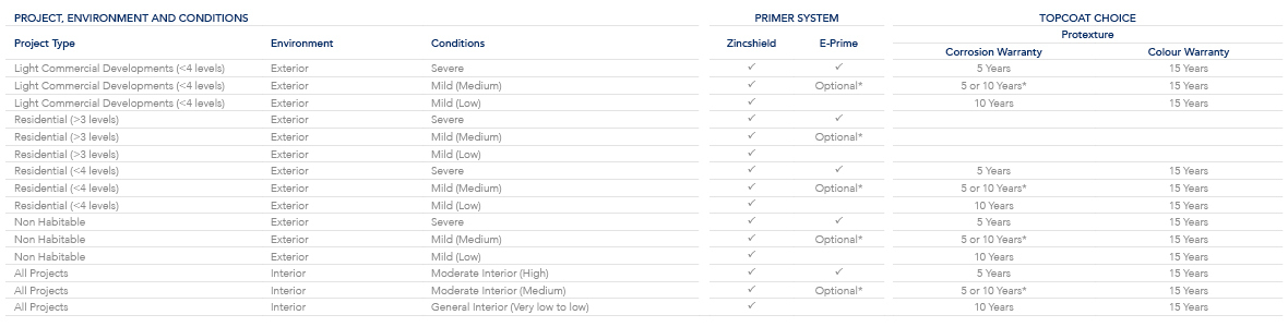 Use the following table to help identify the product choice you have to gain a Steel Shield™ warranty on your project. Refer to the conditions information to determine the environment that your project will be exposed to.