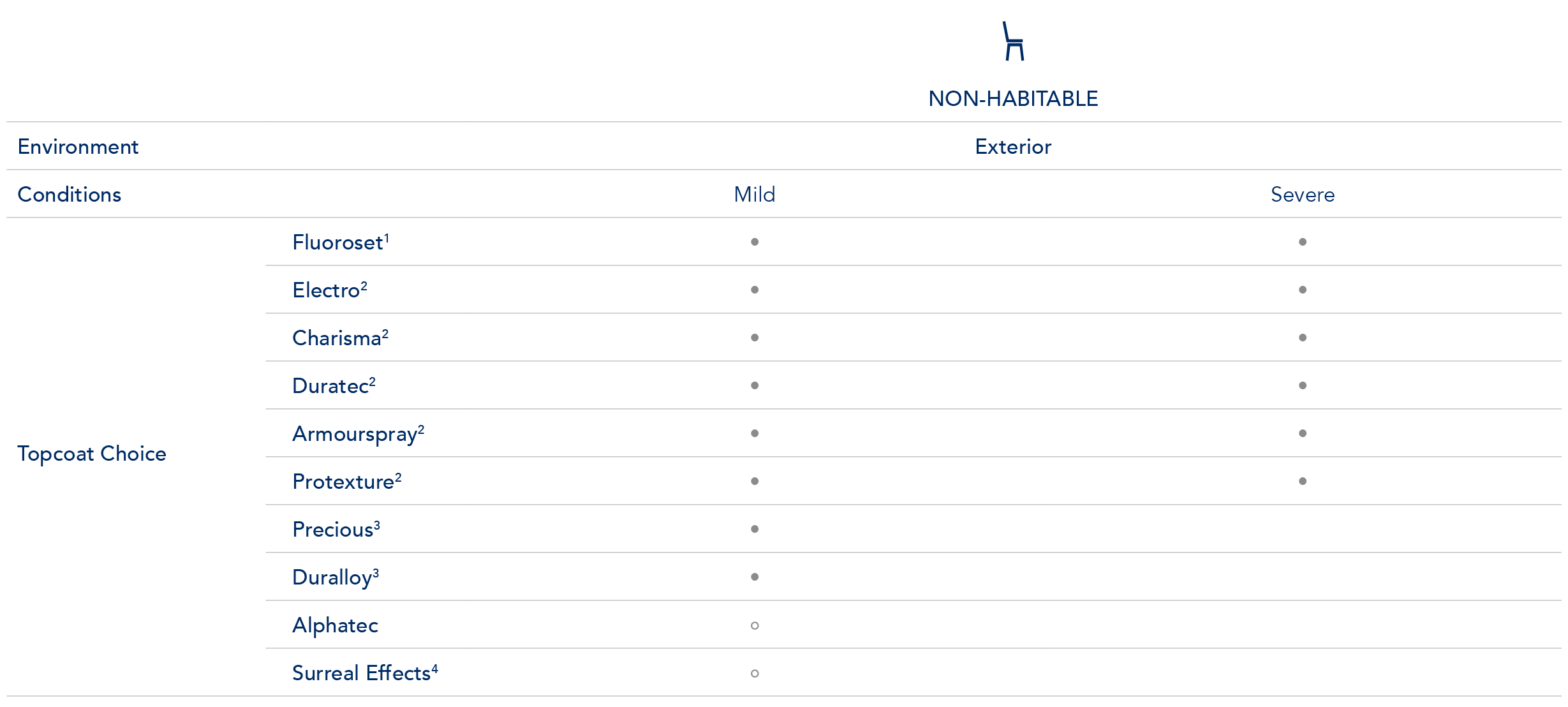 b. Severe – Protexture, Armourspray, Duratec, Charisma, Electro and Fluoroset (E-Prime base coat mandatory)