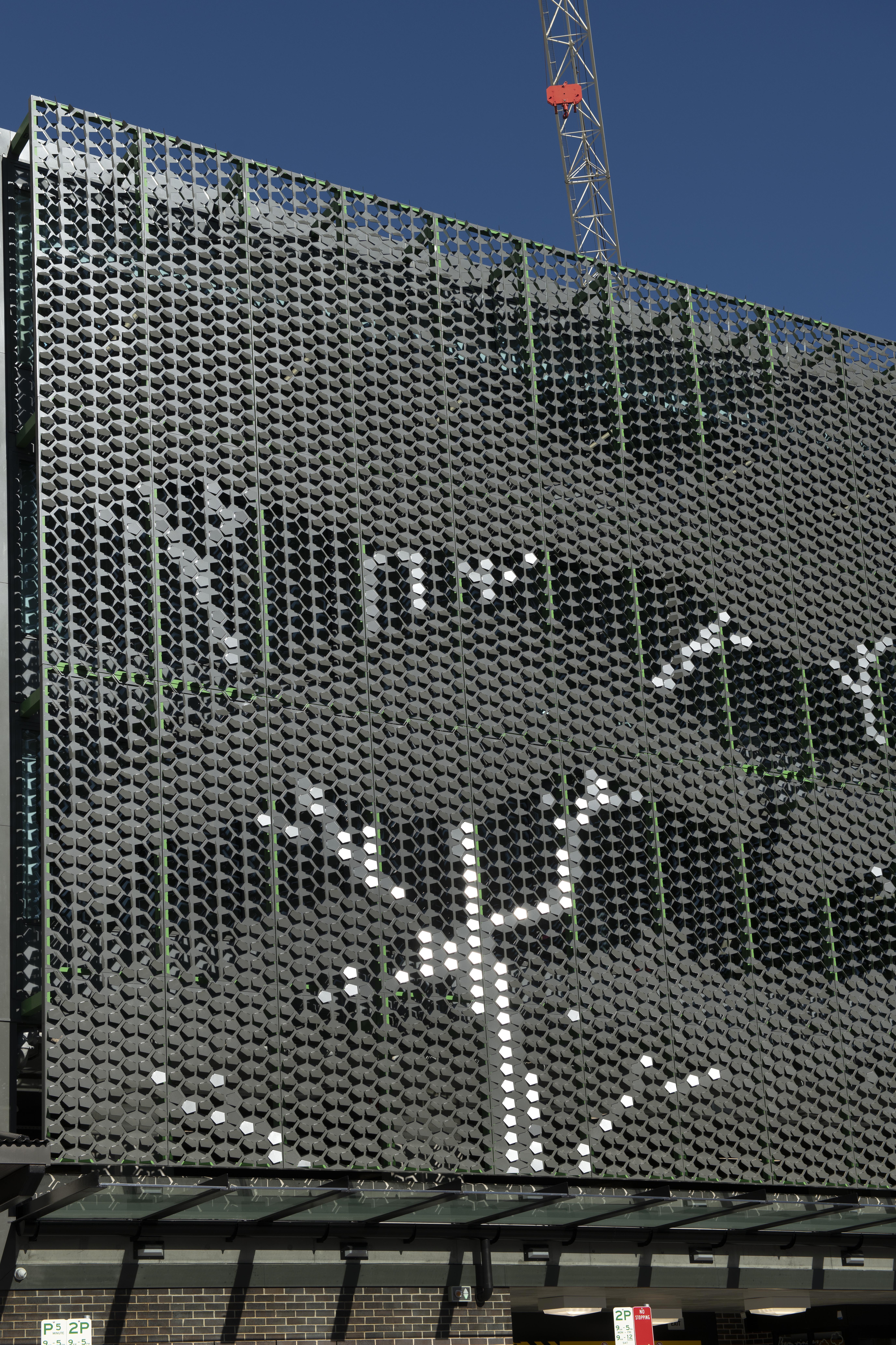 The screen features both Duratec Eternity Titanium Pearl and bright Duratec Intensity Leaf, which have been used on different sides of the screen. Pentagon shapes have been punched out of the screen and cleverly angled to create the image of a eucalypt tree using the two colours.
