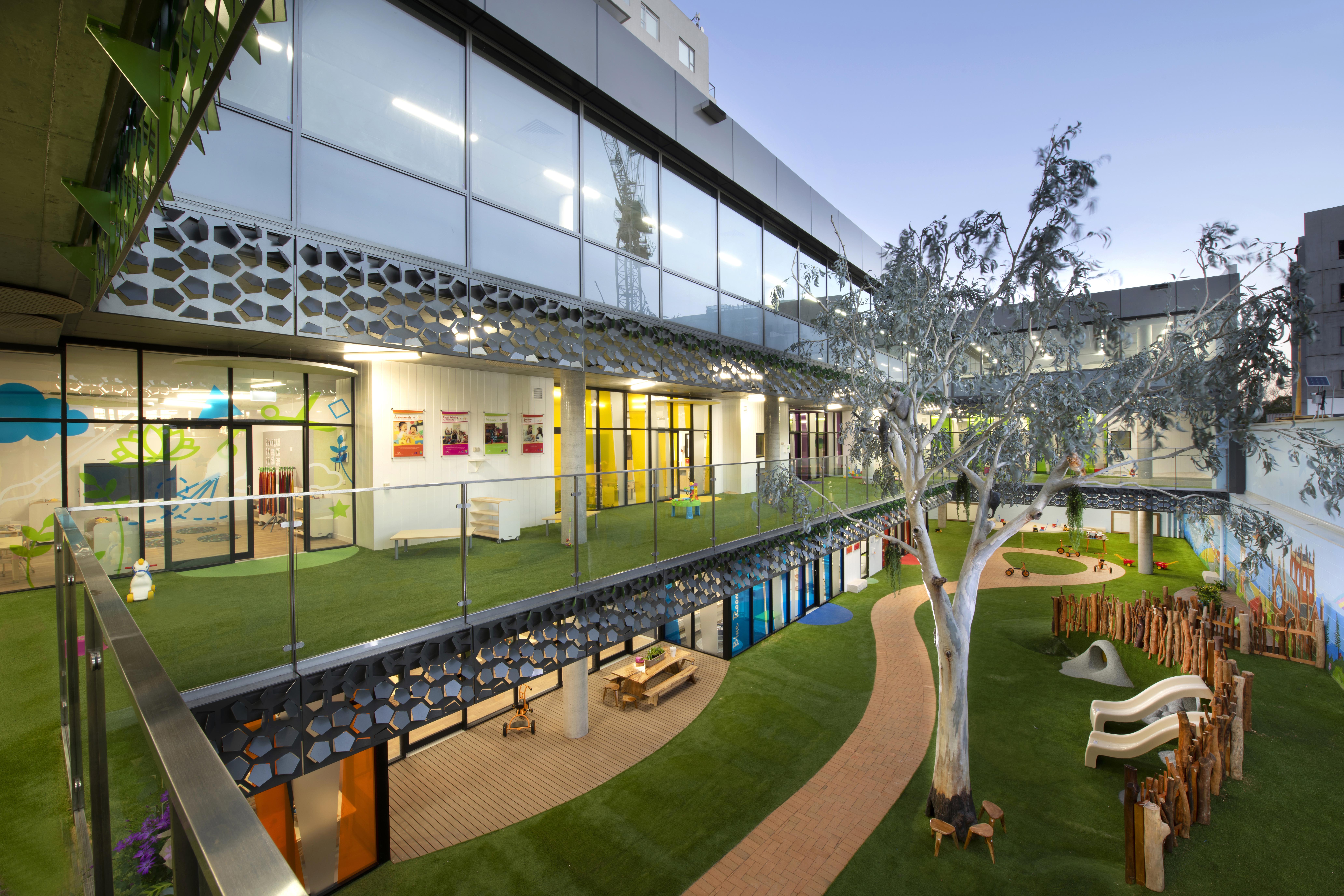 Go Kindy, an urban childcare facility located in Newcastle, NSW was a finalist in the 2019 Dulux Colour Awards in the Commercial Interior – Public Space and Hospitality category. The centre contains several internal playrooms over 3 levels, each directly accessing a large open landscaped play area and a 10m high powder coated model eucalypt tree screen.