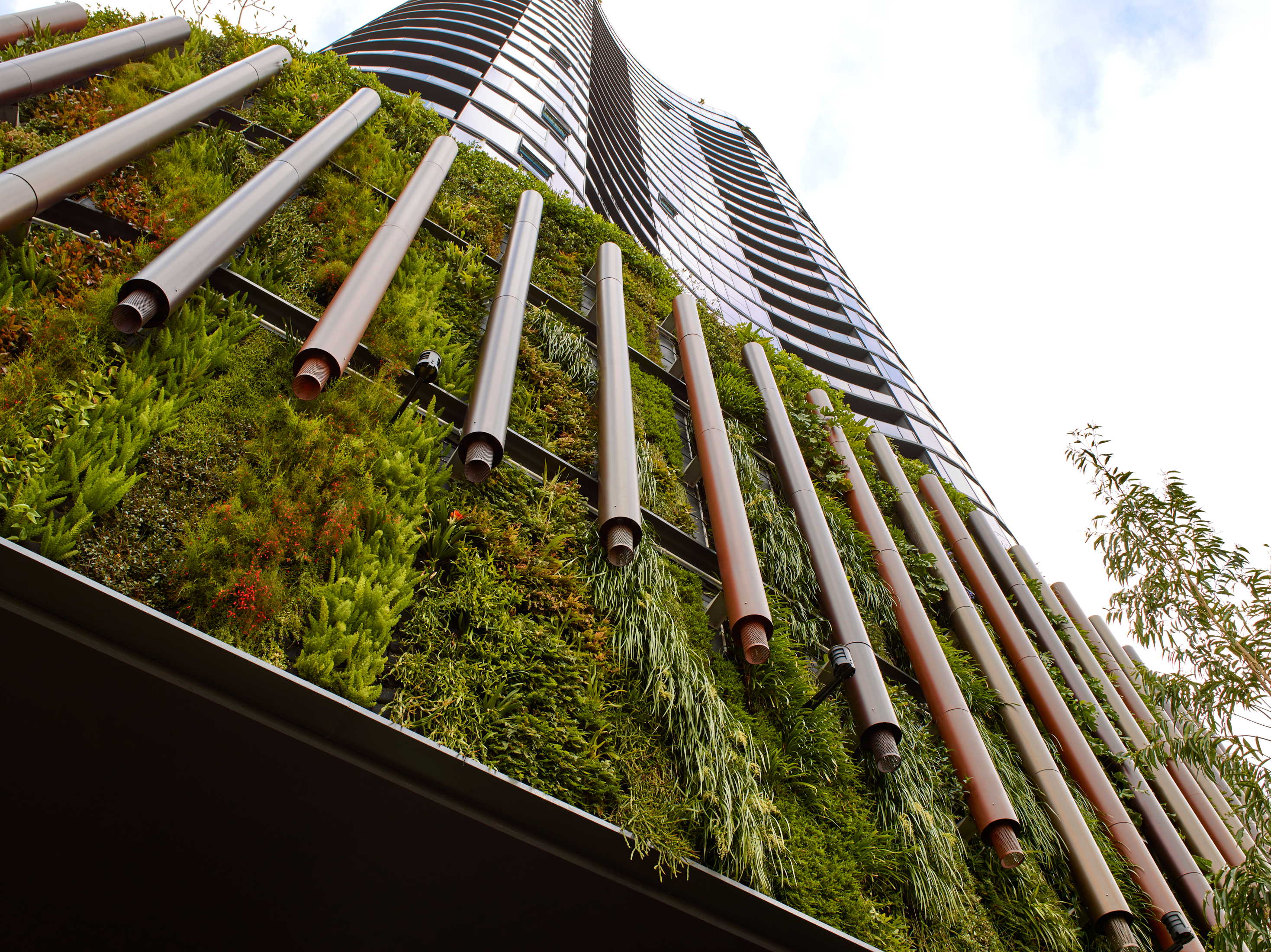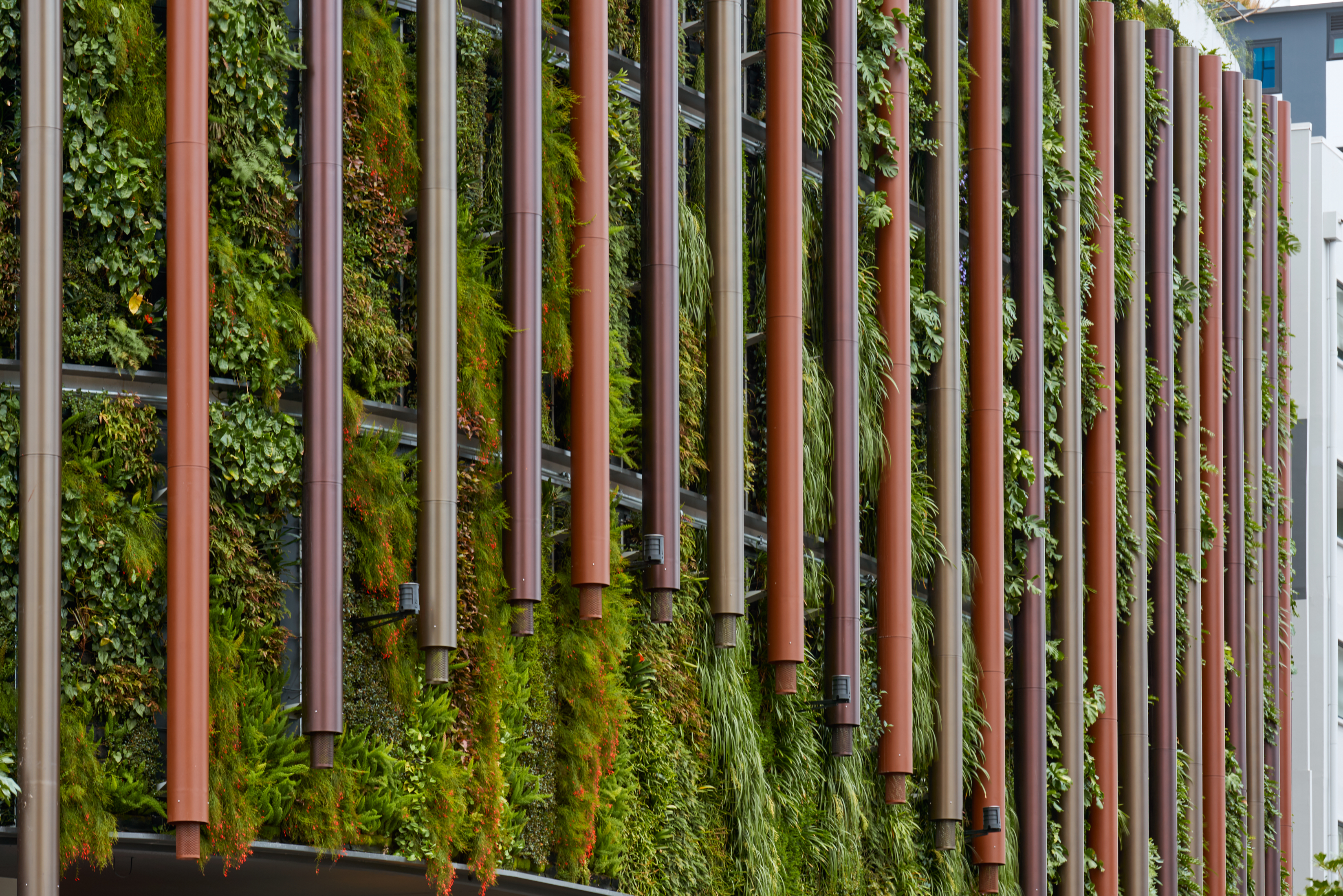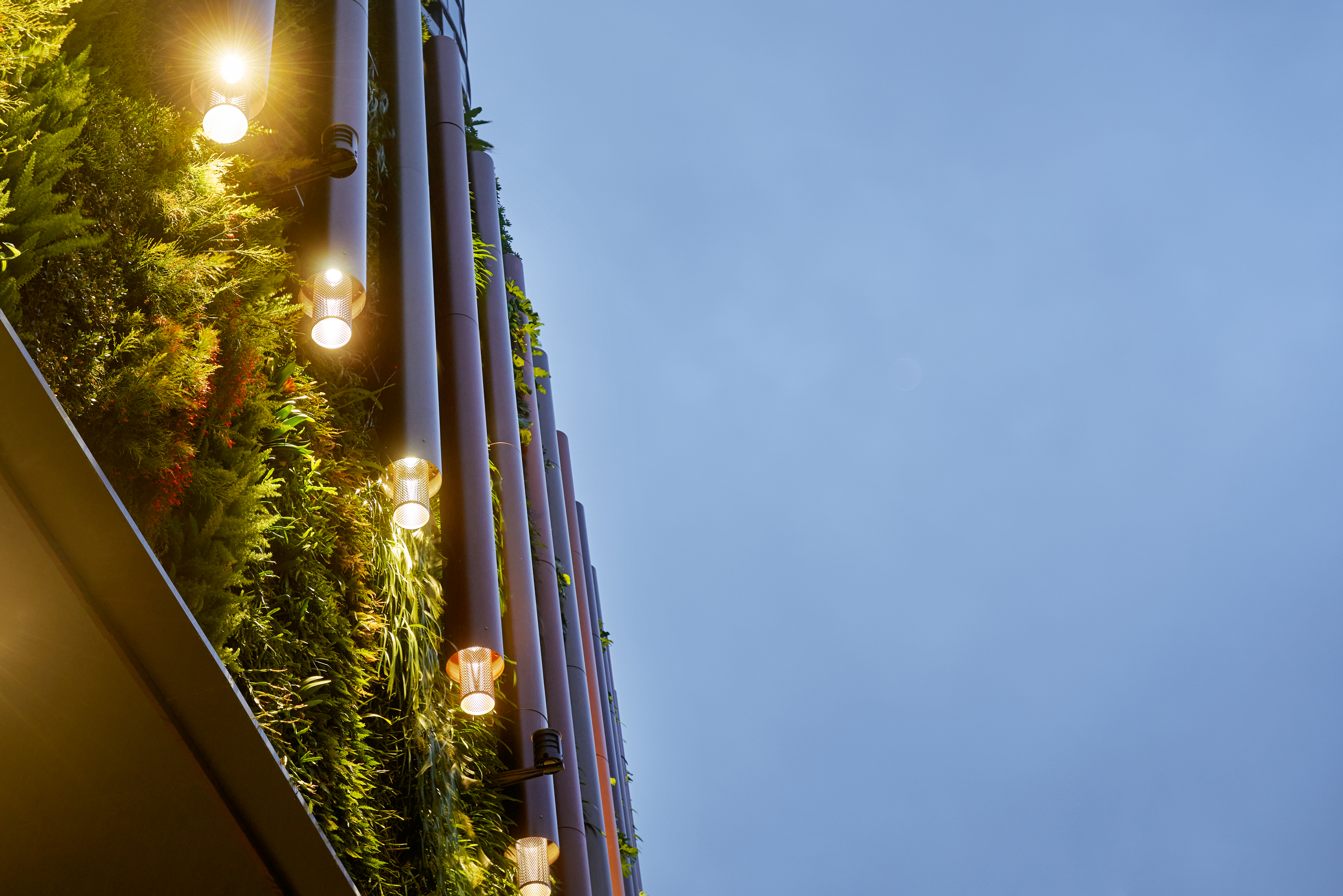 The pipes have been integrated into a living green wall, cladding the exterior of the building and include lights that illuminate the greenery at night.
