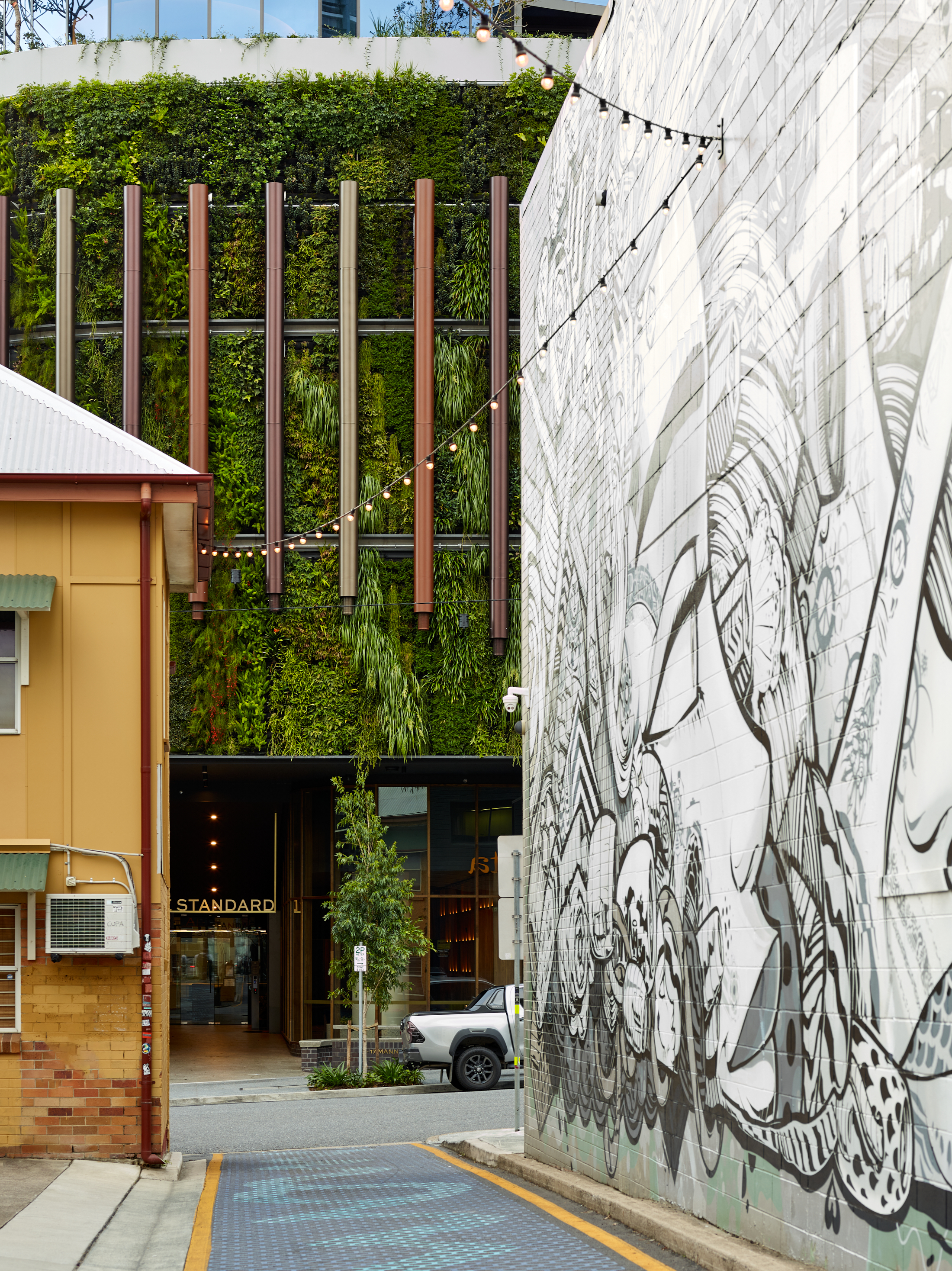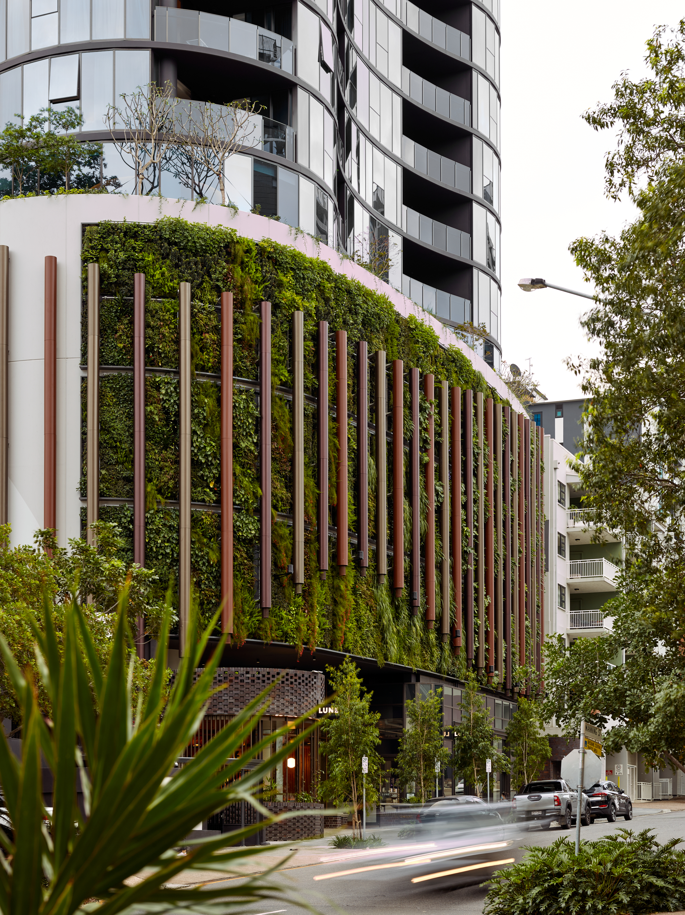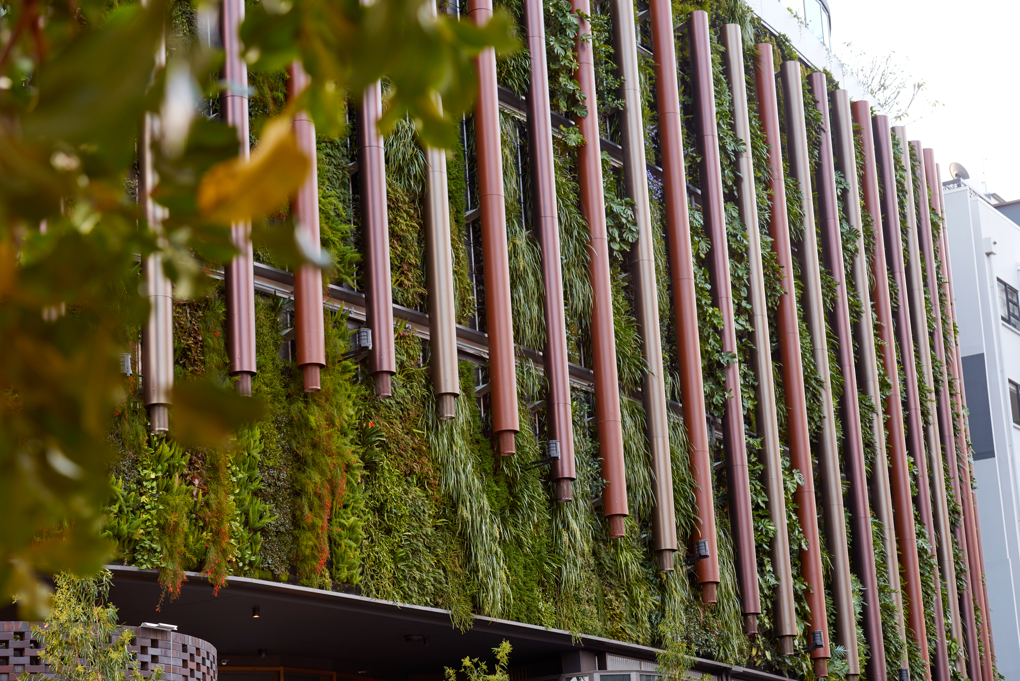 The pipes have been integrated into a living green wall, cladding the exterior of the building and include lights that illuminate the greenery at night.