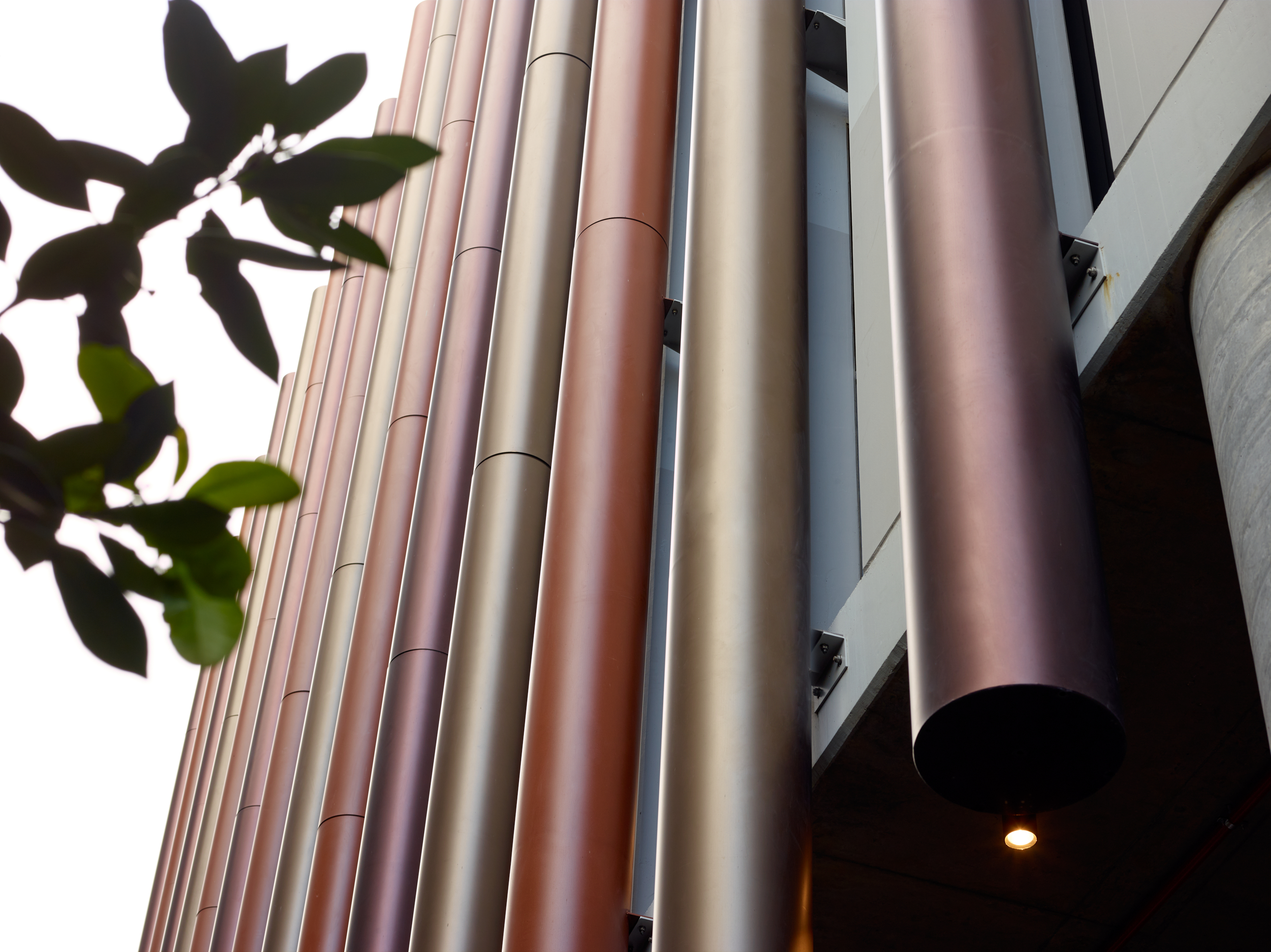 The building is constructed as four large cylindrical forms, joined together by a single glazed tower. Four hundred and fifty-one cylindrical powder coated pipes span up the sides of the building, from the podium to level 6.