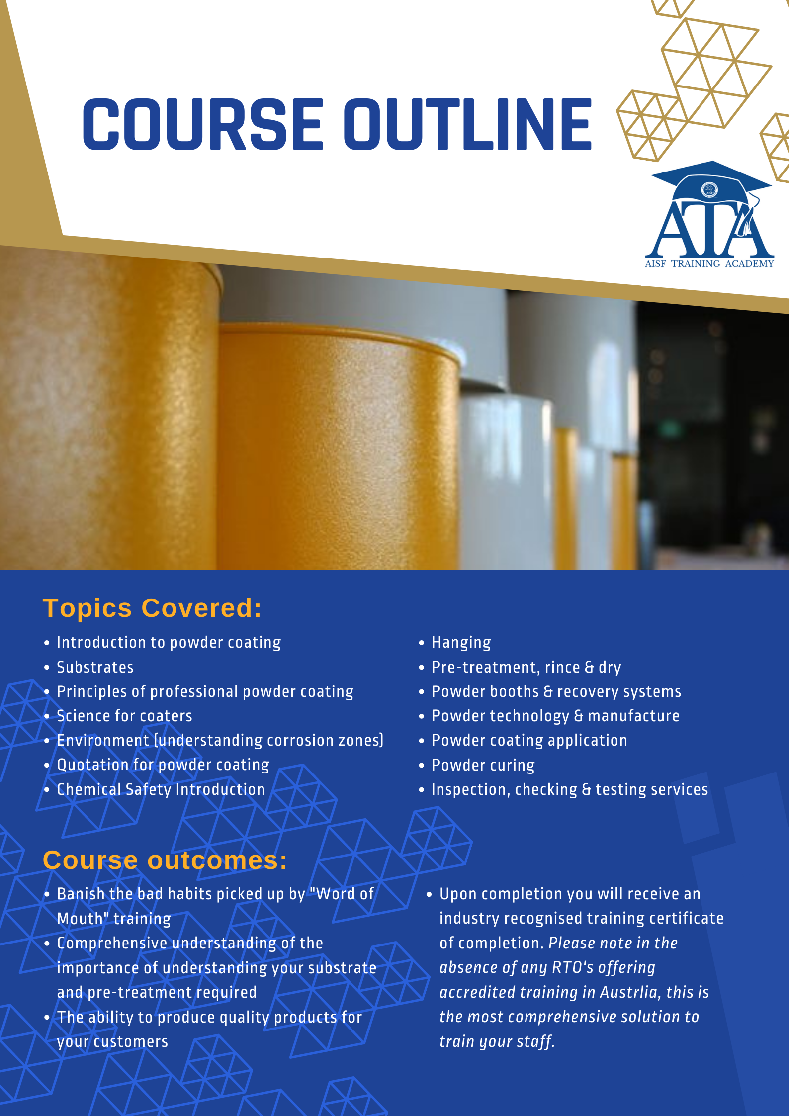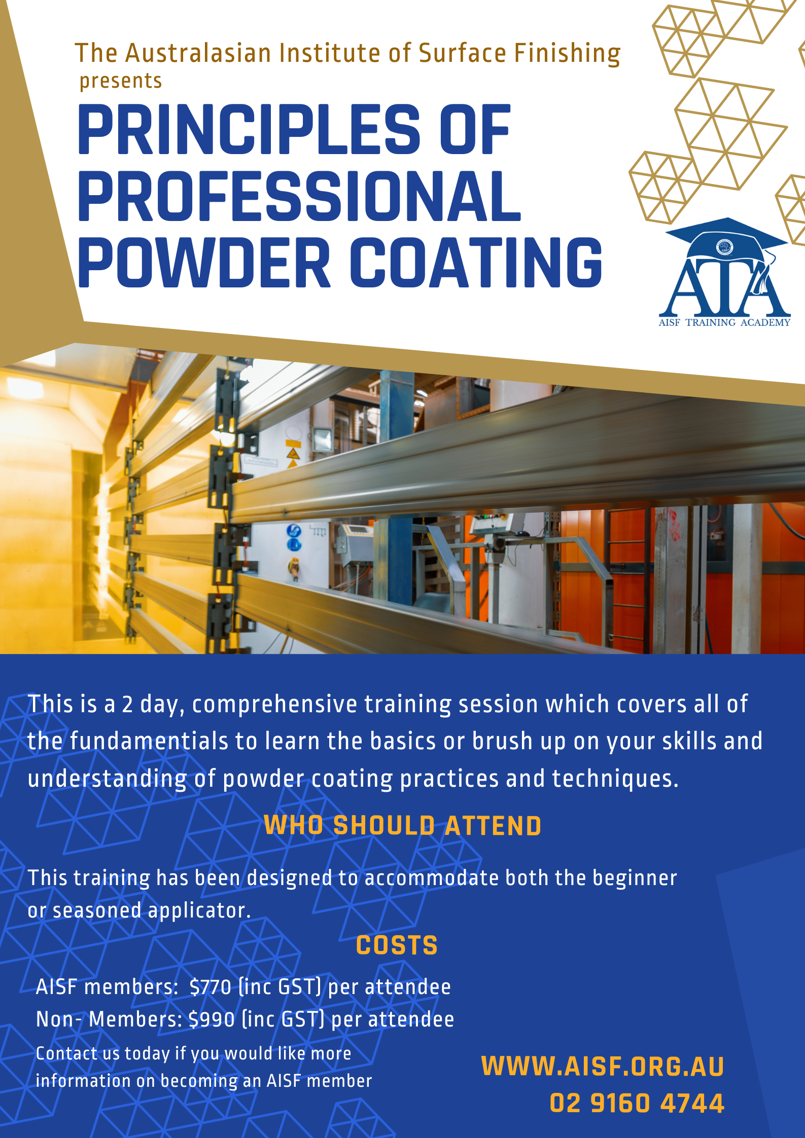 The Australasian Institute of Surface Finishing (AISF) is running a two-day Principles of Professional Powder Coating course, hosted by industry professional applicators & suppliers.