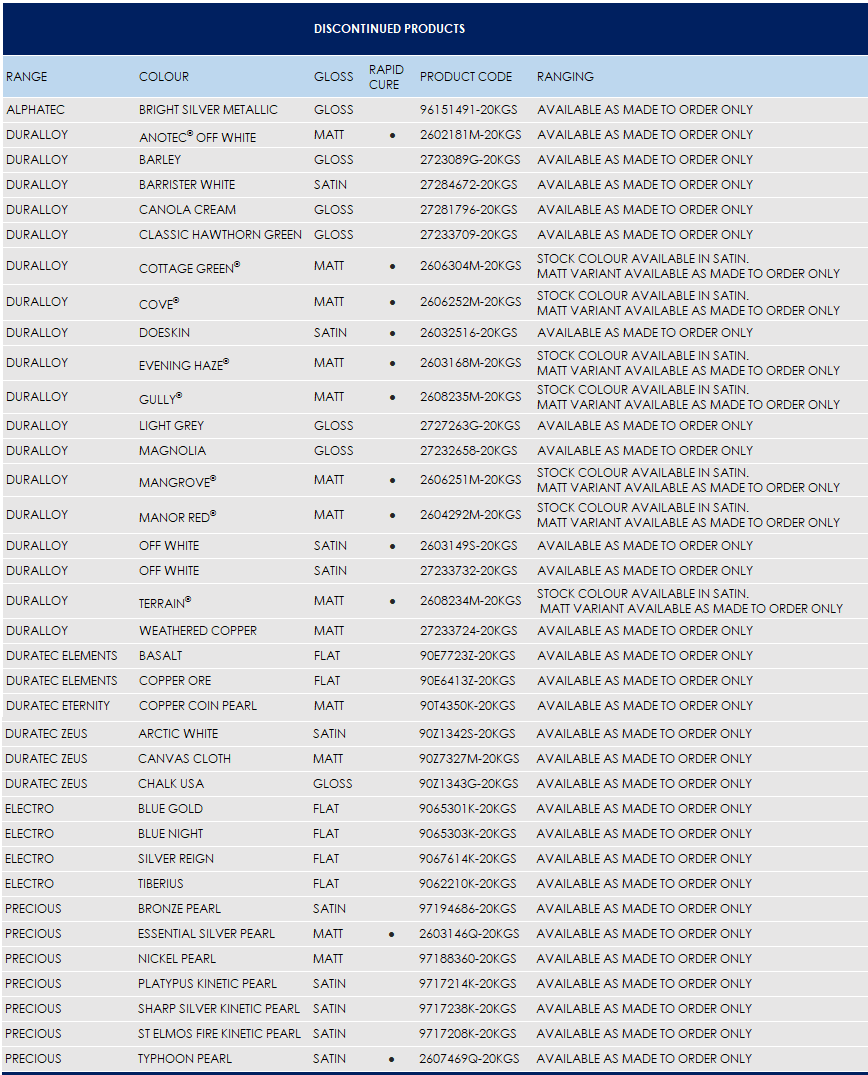 Following a review of our product ranges and to make way for new colours featured in our new Architectural Colour Selectors, the colours listed below have been discontinued and removed from our core stocked range.