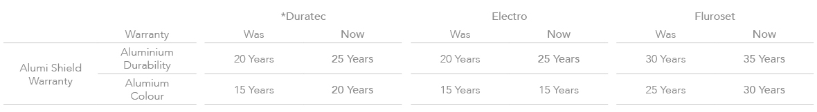 Alumi ShieldTM warranties for Dulux Duratec, Electro and Fluoroset premium powder coat ranges are available for architectural aluminium applications on most commercial, residential and non-habitable projects. They are all now backed for longer with: