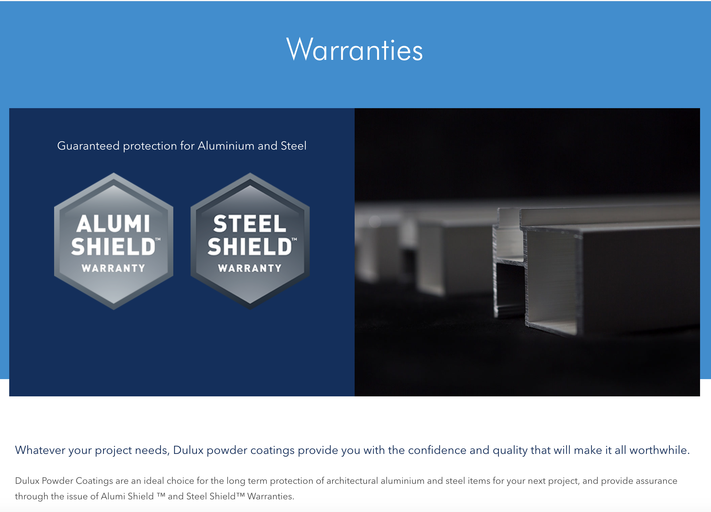 - Warranty – Whether it be for Dulux Alumi Shield TM or Dulux Steel Shield TM warranty