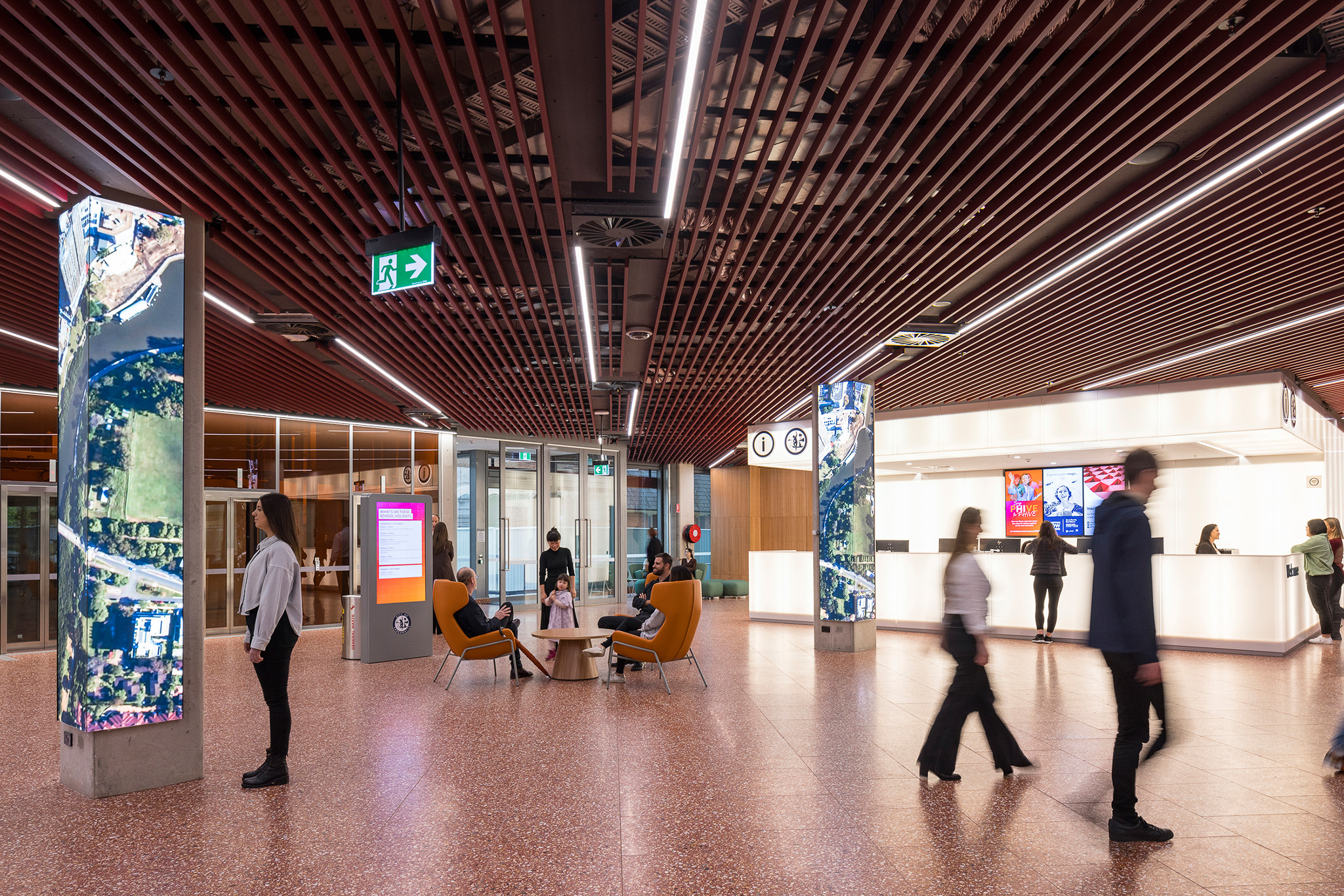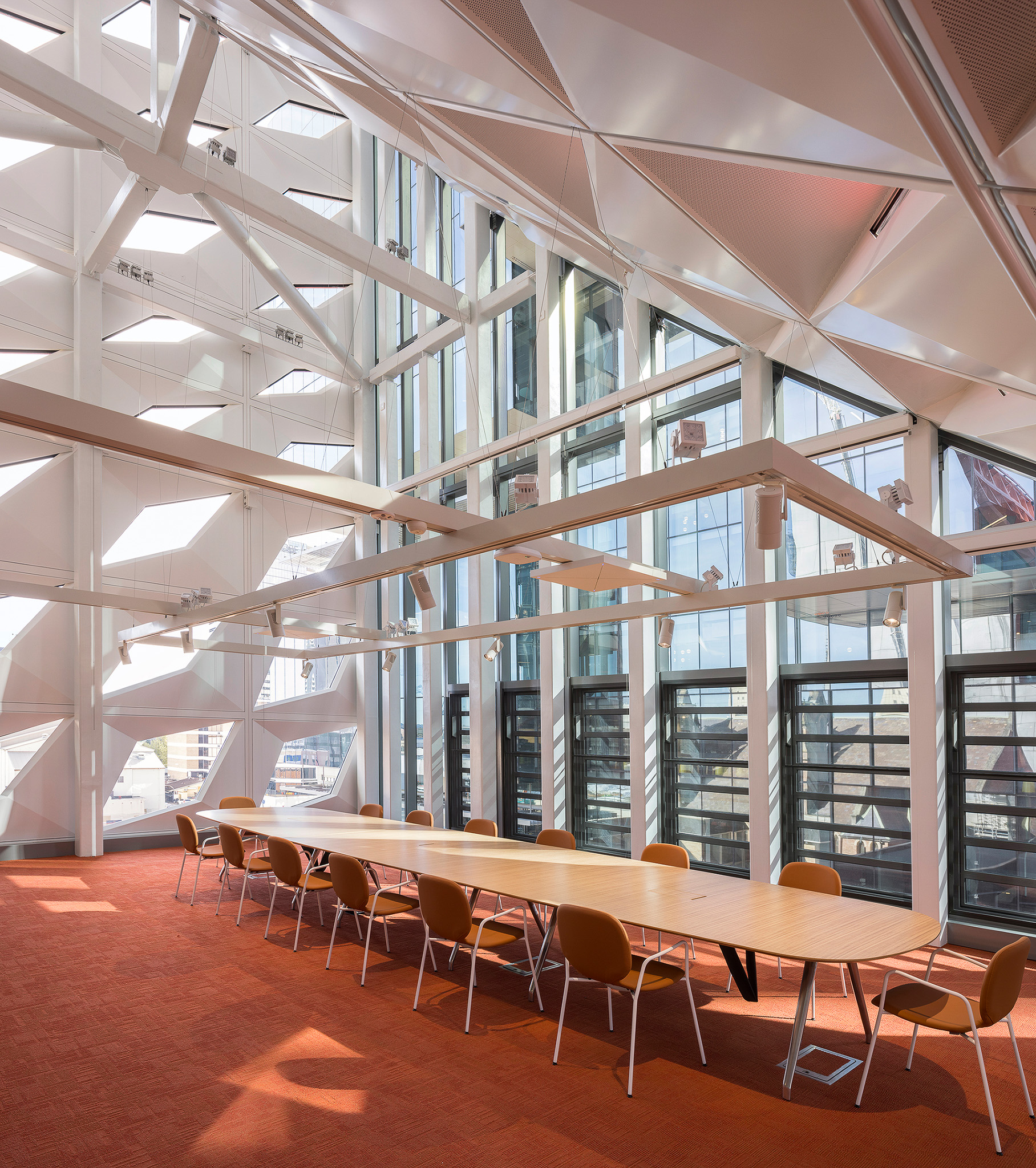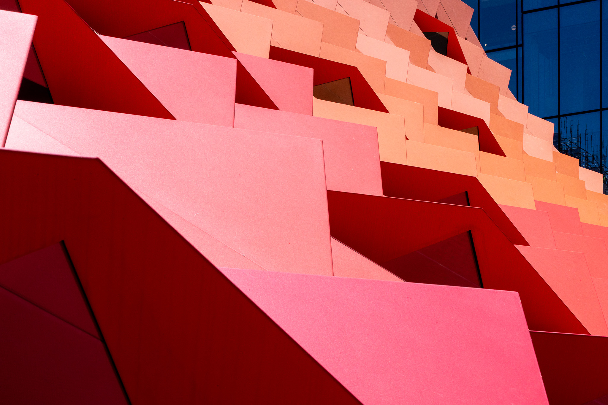 The building takes inspiration from flora endemic to the area. The panellised skylight and facade system developed for the building allowed the team to specify an unexpected array of red-hued colours that transition from deep and dark at the lowest levels up to pale at the spire.