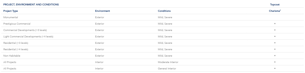 Use the following table to help identify where Charisma can be applied on aluminium projects, the system required and the Dulux Alumi Shield™ warranty level available. Refer to the conditions information to determine the environment that your project will be exposed to.