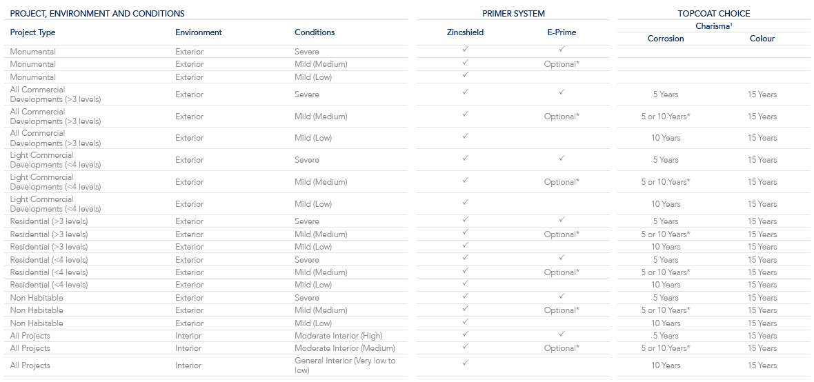 Use the following table to help identify the product choice you have to gain a Steel Shield™ warranty on your project. Refer to the conditions information to determine the environment that your project will be exposed to. Click on the table below for a larger version.
