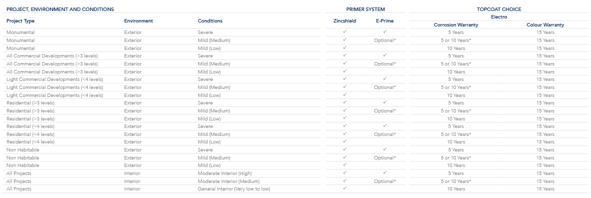 Use the following table to help identify where Electro can be applied on aluminium projects, the system required and the Dulux Alumi Shield™ warranty level available. Refer to the conditions information to determine the environment that your project will be exposed to.