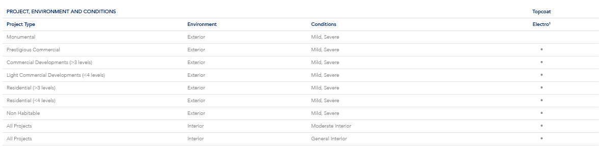Use the following table to help identify the product choice you have to gain a Steel Shield™ warranty on your project. Refer to the conditions information to determine the environment that your project will be exposed to. Click on the table below for a larger version.