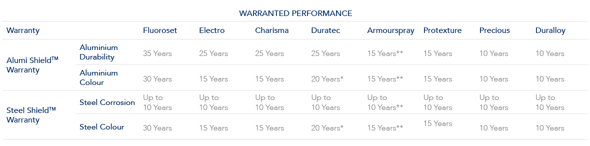 **The Alumi Shield and Steel Shield Colour Warranties are not applicable to Armourspray clear products. The Alumi Shield and Steel Shield Durability Warranties only apply to Armourspray clear products when applied over Dulux Protexture, Duratec, Electro & Charisma powder coatings.